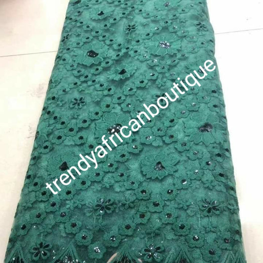 • New arrival soft quality emerald green french lace fabric with all over sequence. Great quality. Sold per 5yds.price is for 5yds. Aso-ebi price available. Contact us for details
