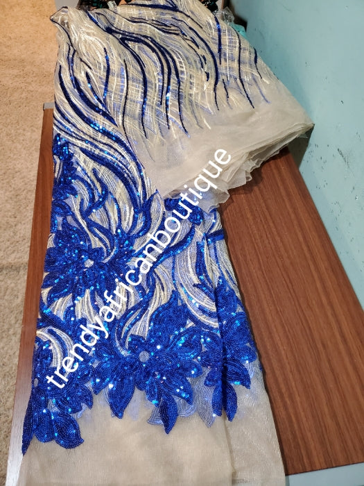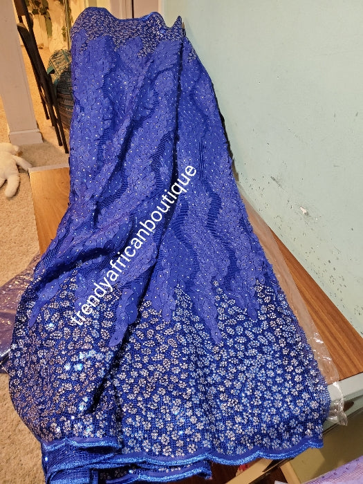 Sale sale: Lustrous quality Africa french lace fabric over sequence. Royal blue embeliished with silver sequence border. Sold per 5yds, limited quantity. Sold per 5yds lenght, price is for 5yds. Feel the difference in quality