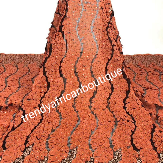 • Sale sale: Lustrous quality Africa french lace fabric with all over sequence. Burnt orange lace/black with gold sequence. Sold per 5yds. Aso-ebi lace limited quantity. Sold per 5yds lenght, price is for 5yds. Feel the difference in quality