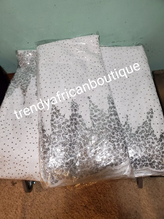 Sale sale: Lustrous quality Africa french lace fabric with all over sequence. Pure white lace with silver sequence border. Sold per 5yds. Aso-ebi lace limited quantity. Sold per 5yds lenght, price is for 5yds. Feel the difference in quality
