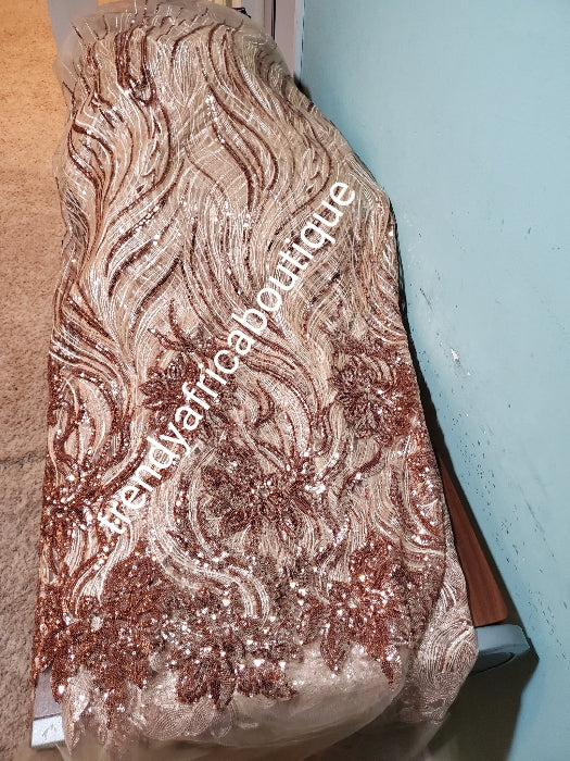 • New arrival soft quality champagne/rose gold  french lace fabric with all over sequence. Great quality. Sold per 5yds.price is for 5yds. Aso-ebi price available. Contact us for details. Free shipping within U.S