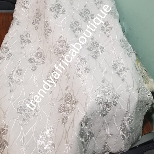 • Sale: Pure white sequence Double Organza swiss lace Fabric. Beautiful handcut lace embellished with sequence. Classic Big Nigerian party lace sold per 5yds. Exclusive celebrant organza ideal for Iro/buba
