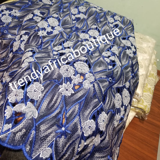 Navyblue/gray sequence Double Organza swiss lace Fabric. Beautiful handcut lace embellished with sequence. Classic Big Nigerian party lace sold per 5yds. Exclusive celebrant organza ideal for Iro/buba!!