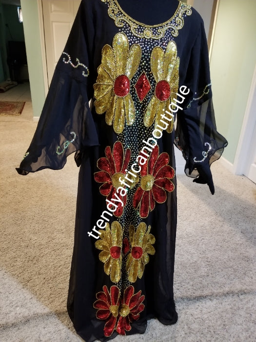 • Ready to ship: Black dubai kaftan  dress. free flowing embellished with Multi sequence front and back dress to perfection. Availablein size, ,L, and XXL.. Chiffon includes headtie. 60' long