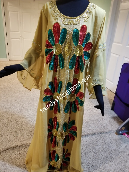 Ready to ship: Beige dubai kaftan dress. free flowing embellished with Multi color sequence front and back dress to perfection. Availablein size, M,L,XL. Chiffon includes headtie. 60' long