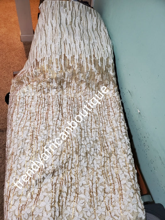 • Exclusive unique Organza swiss  lace fabric. Embellished with sequence and stones. Big Quality design for wrapper, skirt /blouse. Cream/champagne gold lace fabric sold per 5yds. Nigerian wedding fabric