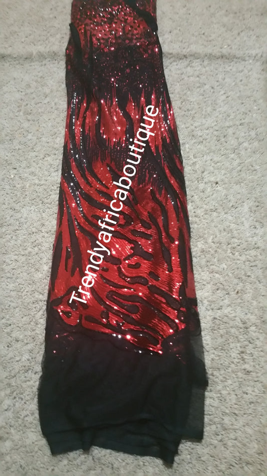 • Red/black net sequence Nigerian french lace fabric for making party dress. Sold per 5yds