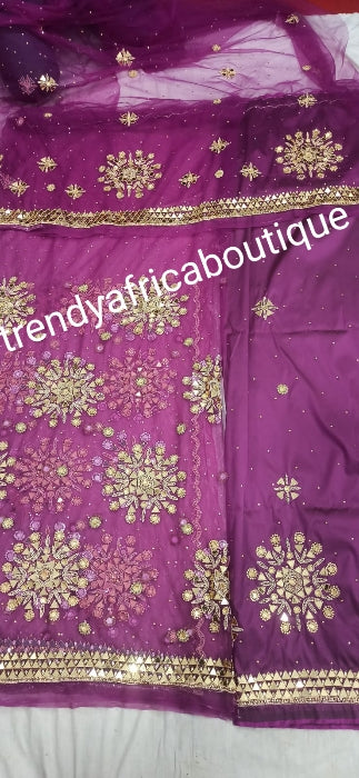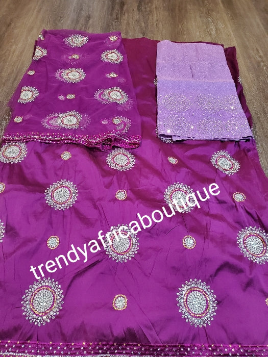 3 in 1 combo sale. 5yds magenta wrapper, net blouse, lilac quality stoned ask oke gele, free blouse lining! Nigerian/Igbo/Delta Traditional George magenta wrapper set. Embellished with crystal stones, quality taffeta silk. Top quality hand work