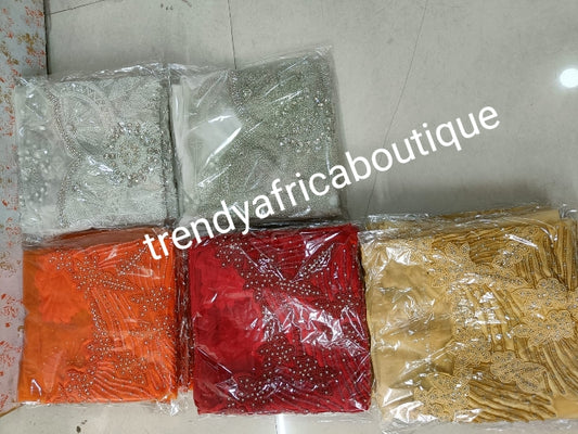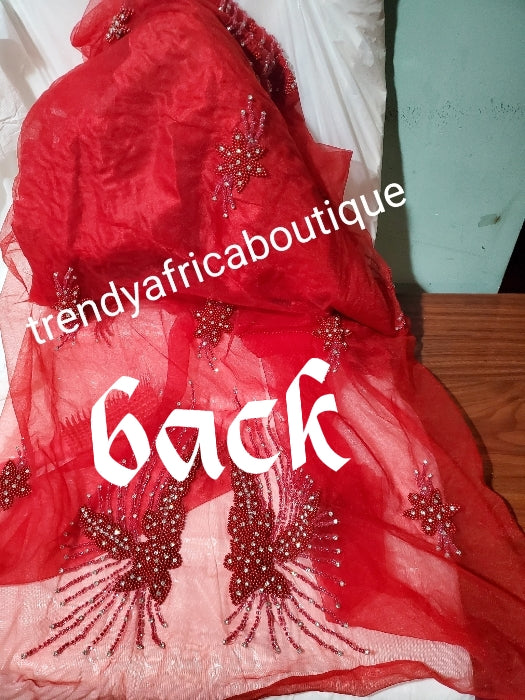• Red Heavily-beaded/crystal stones net George for making blouses. Popularly use by Igbo/Delta/edo women for big Occasions. Comes in 1.8yds lenght already design for your beautiful celebrant blouse