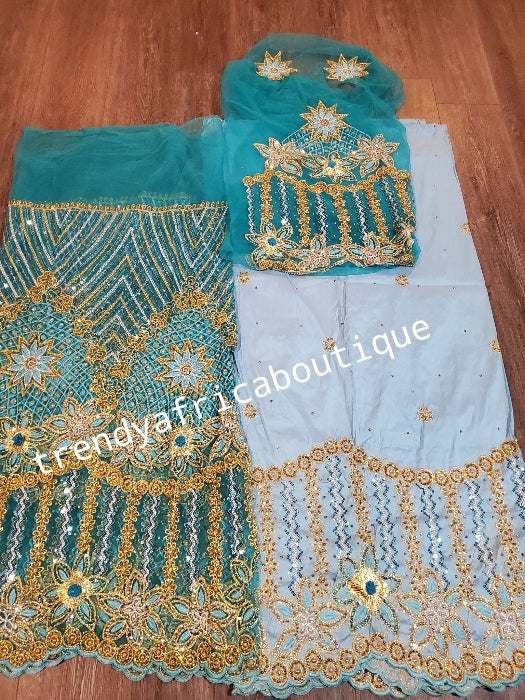 Ready to ship: sky blue taffeta silk George 2.5ys + beaded and stoned skyblue net + 1.8yds sky blue net for blouse. perfect stone work for traditional Bridal outfit. Sold as a set, price is for a set. .
