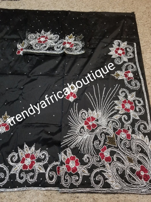 • Special offer Nigerian Traditional wedding hand stoned silk George Wrapper and matching net blouse. Black with silver/red/gold crystal stones.  Beaded and stoned on the side border as well