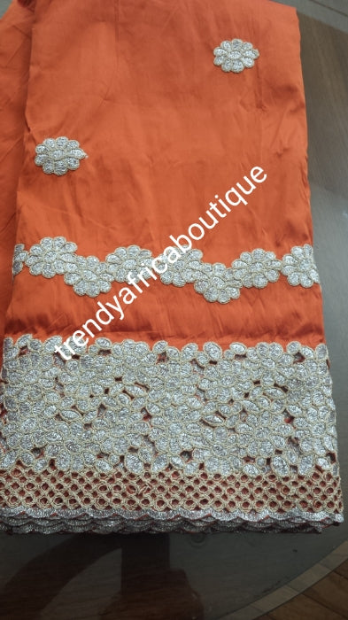 • Sale sale: Nigerian Tranditional George wrapper. Embriodery/stones design in Orange/champagne with matching blouse. Small-George. Classic border design can be use for any Styles.