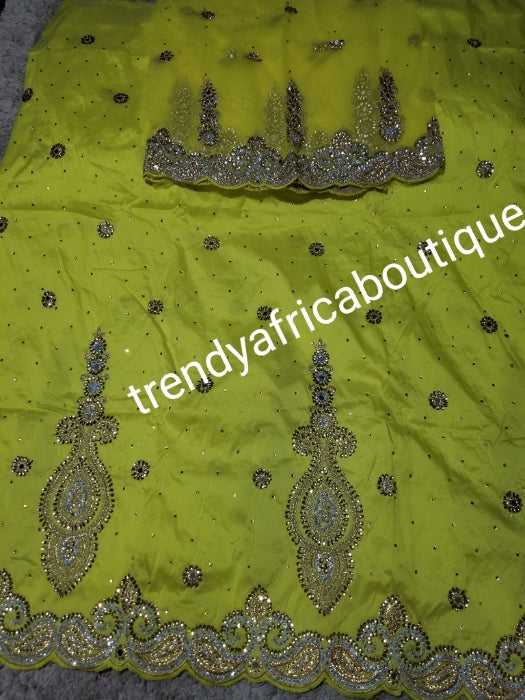 SALE,SALE- New arrival Nigerian Tranditional wedding George wrapper. Embellished with quality dazzling beads/crystal stones design in rich yellow. Full 5yds + 1.8yds matching blouse. Indian-George.