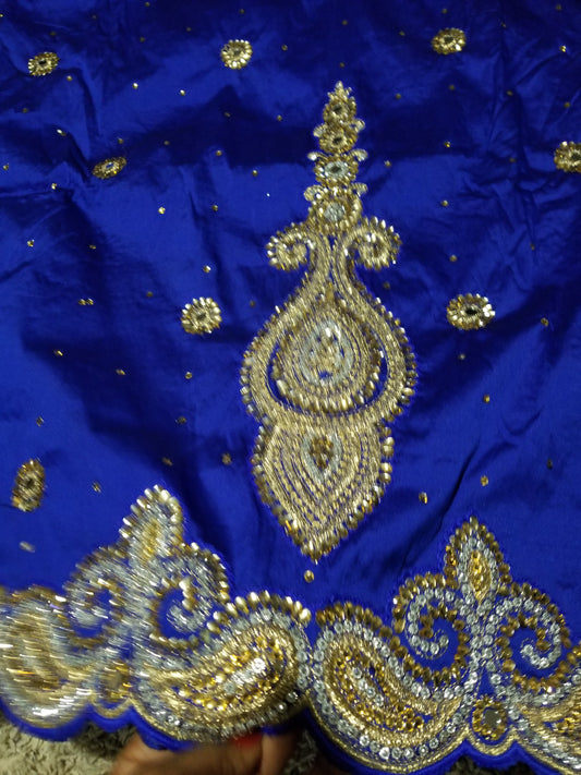 • SALE,SALE- New arrival Nigerian Traditional wedding George wrapper. Embellished with quality dazzling beads/crystal stones design in royal blue. Full 5yds + 1.8yds matching blouse. Indian-George.