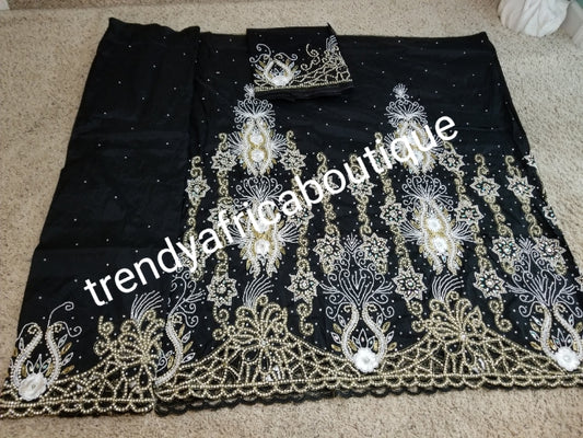 Ready to ship: Exclusive Black Madam/celebrant Nigerian George wrapper. Beaded and stoned with hand cut border. Special occasion wrapper. 5yds + 1.8yds matching net (now sewn) for blouse. Tradtional Igbo/Delta Bridal outfit