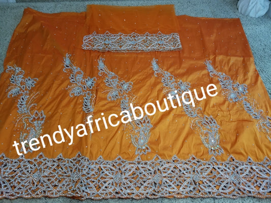 Nigerian traditional wedding . Beautiful orange Niger/Igbo/delta traditional wedding George wrapper. hand stoned with dazzling crystal stones to perfection. for special occasion. 2.5yds + 2.5yds + 1.8yds net blouse. Beautiful handcut border.