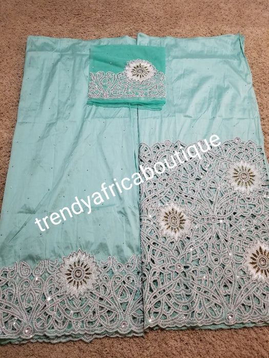 • Latest VIP hand cut embriodery Silk George wrapper and matching net blouse. Mint green George, All Crystal stones to perfection. Quality Guaranteed. 2 wrapper of 2.5yds each and 1.8yds blouse. Nigerian madam George/Igbo Delta women