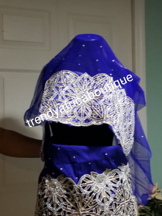 • Latest VIP hand cut embriodery Silk George wrapper and matching net blouse. Royal blue George, All Crystal stones to perfection. Quality Guaranteed. 2 wrapper of 2.5yds each and 1.8yds blouse. Nigerian madam George/Igbo Delta women