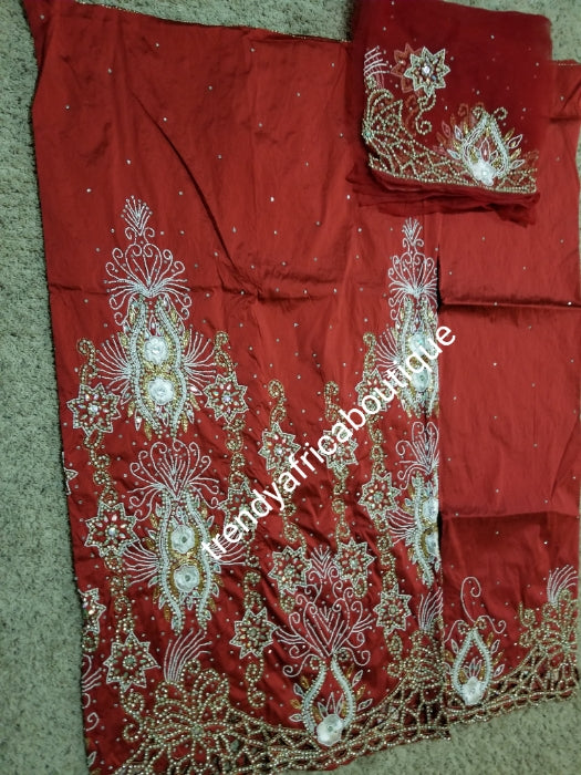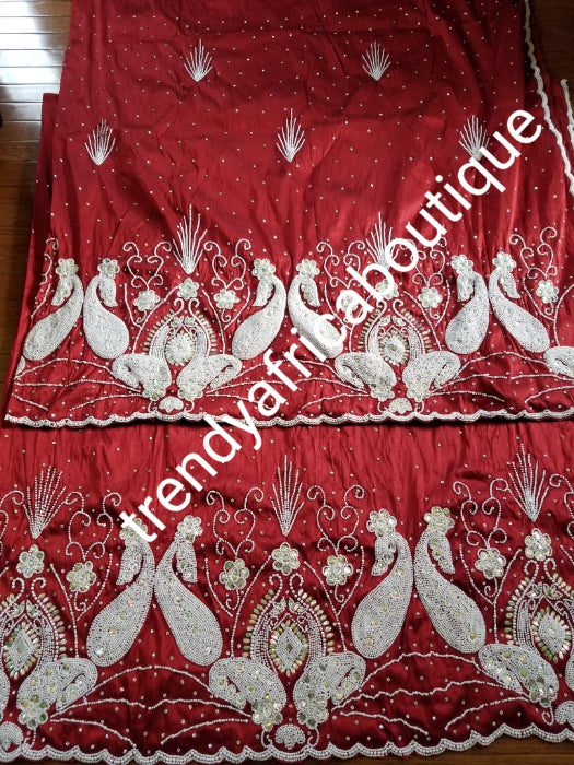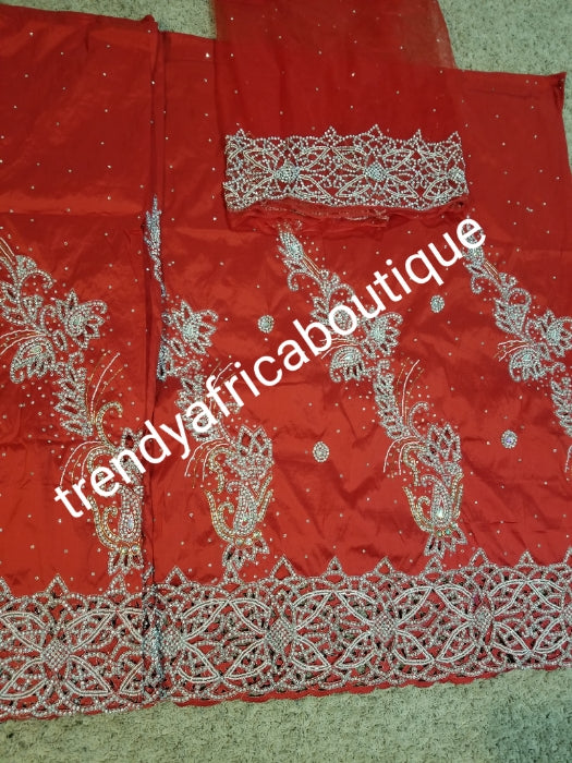 • quality Red Nigerian Traditional silk George wrapper. Beaded and stoned in Red color. 2.5yds + 2.5yds and a net fabric for Blouse combinations. Sold as a set. This is special offer george