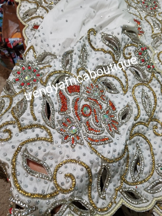Pure White VIP Celebrant silk George wrapper. Stoned to perfection with Red/multi-color stones. Hand cut border. Niger/Igbo/delta traditional wedding hand made George for special occasion. 2.5yds + 2.5yds + 1.8yds net blouse