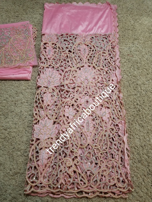 Ready to ship, Nigerian VIP traditional wedding/ceremonia George wrapper and matching net for blouse(now sewn). Sweet pink color, top wrapper is all over hand cut, beaded and stoned to perfection. Super quality silk George for igbo/delta weddings