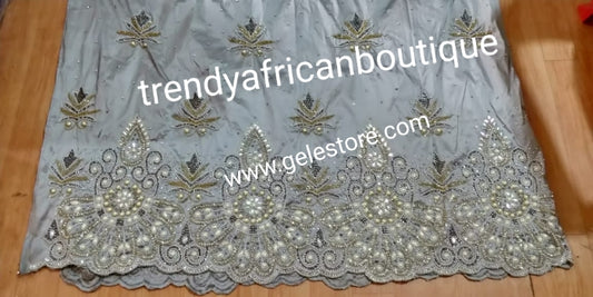 Ready to ship quality ash/Gray Taffeta Silk Beaded and Stoned Nigerian traditional wedding George wrapper. Classic Wrapper for Niger/Igbo/delta wedding outfit. Sold as 2 wrapper + matching net for blouse. Quality guarantee!!!