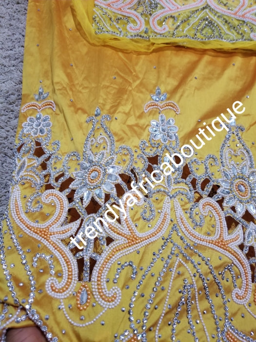 Ready to ship Sweet musterd yellow crystal stoned/beaded Nigerian traditional Igbo Bridal George wrapper with matching net blouse. 5yds silk george + 1.8yds matching net blouse. Hand cut work with exclusive dazzling stone work. Niger/Igbo/delta wrapper