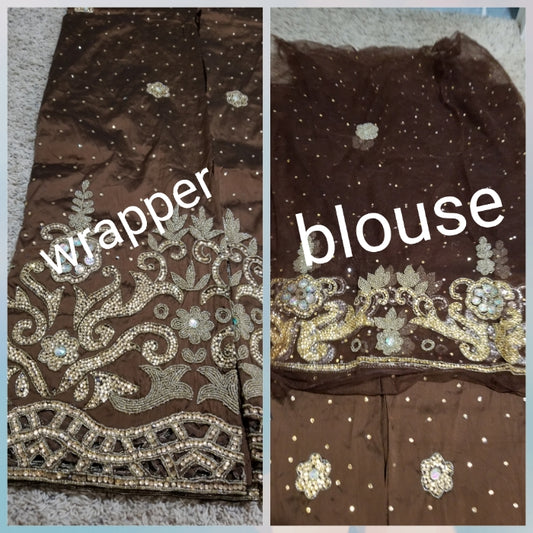 • Sale: New arrival chocolate VIP George wrapper. Nigerian/Igbo/delta women Wrapper in silk George, all hand crystal stones. Chocolate/chocolate 5yds+ 1.8yds matching net blouse