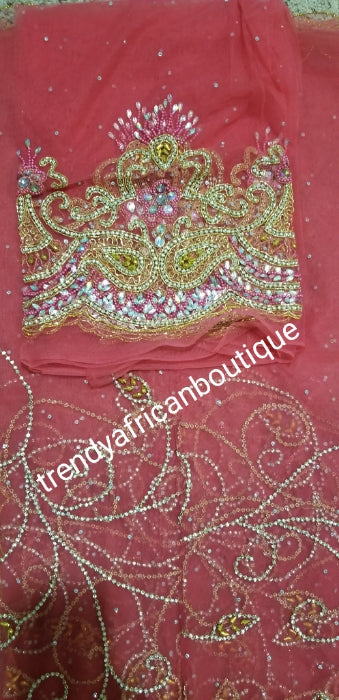 Sale: New arrival Coral color VIP Madam Net George wrapper for Nigerian big event. all hand stoned 5yds net + 1.8yds matching net for blouse. Nigerian Traditional Celebrant Net George. Sold as a set.