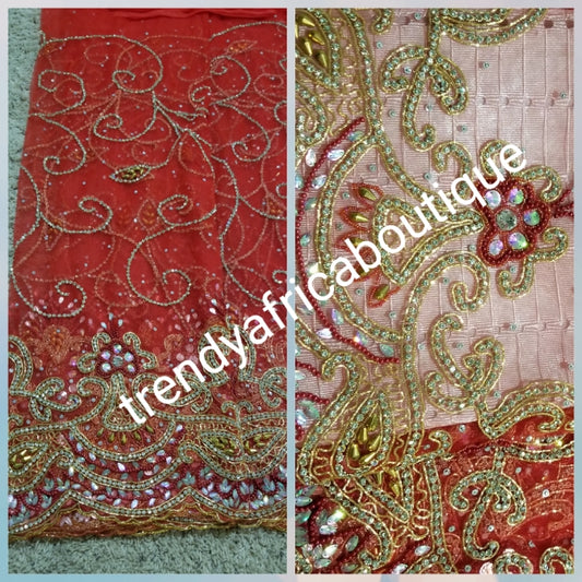 • Sale: New arrival Red color VIP Madam Net George wrapper for Nigerian big event. all hand stoned 5yds net + 1.8yds matching blouse George. Sold as a set. Igbo Bridal Net George for traditional wedding
