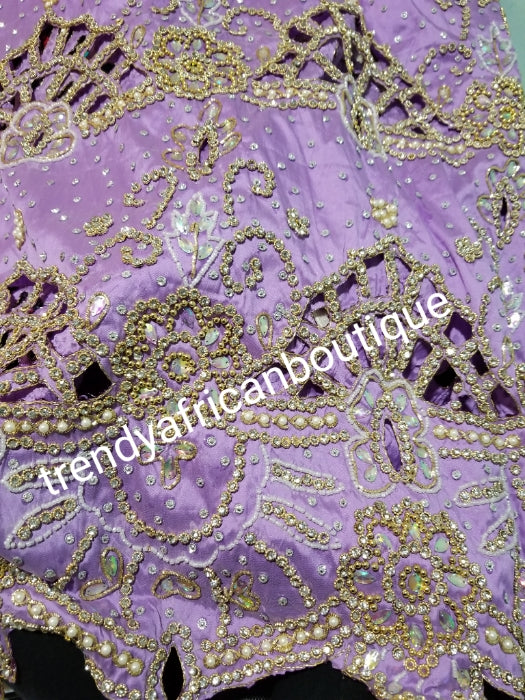 Ready to Ship: Gorgeous Igbo Traditional Bridal outfit- quality Lilac net + Taffeta George wrapper embellished with dazzling Crystals all over. 2 wrapper + 1.8yds net for blouse. Ideal for making Celebrant outfit. Model show wearing Gold Net
