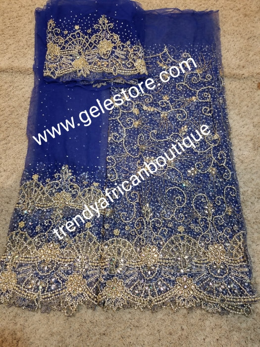 • Ready to ship. Royal blue VIP Celebrant Nigerian women George wrapper. Niger/Igbo/delta quality  beads and dazzled crystal stones for special occasion. 2.5yds + 2.5yds + 1.8yds net blouse. Feel the difference in quality!! Exclusive design for Bride.
