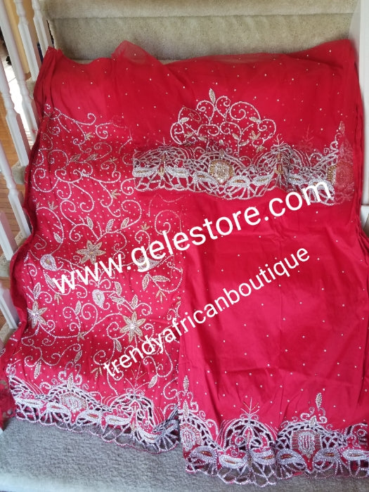 New arrival quality RED VIP Madam Net George wrapper for Nigerian bridal/Celebrant outfit. Net 2.5yds full hand beaded/stoned + Taffeta 2.5yds beaded and stoned border + 1.8yds matching net for blouse . Sold as a set. Taffeta + Net