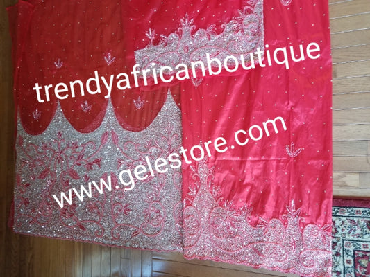 • New arrival quality RED VIP Madam Net George wrapper for Nigerian bridal/Celebrant outfit. Net  2.5yds full hand beaded/stoned + Taffeta 2.5yds beaded and stoned border + 1.8yds matching net for blouse . Sold as a set. Taffeta + Net