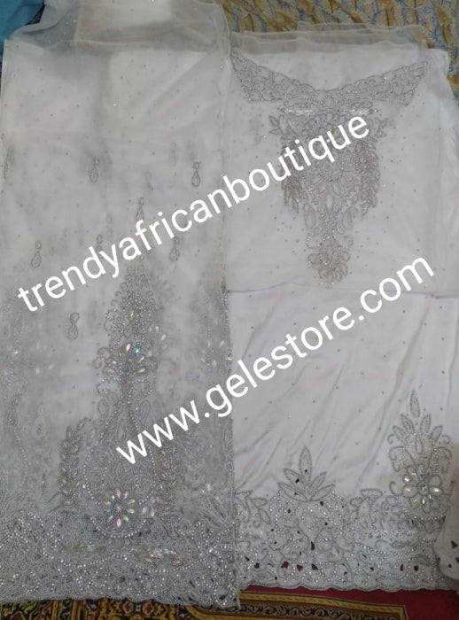 Combo sale: White crystal Net George wrapper 2.5yds Net+ 2.5yds taffeta silk+ 1.8yd net for blouse+ white aso-oke gele all embellished with dazzling silver crystal stones. Nigerian Bridal George for that special occasion. Quality