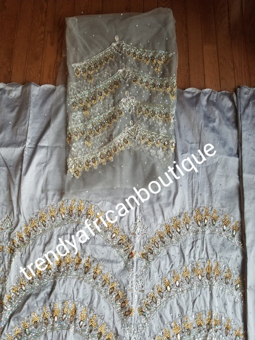 • Ready to ship:  Exclusive design ash/Gray Color VIP hand beaded and stoned Nigerian traditional Celebrant in quality taffeta Silk George wrapper with matching blouse. Niger/Delta/Igbo women Georges. Sold as set of 2 wrapper +1.8yds blouse.