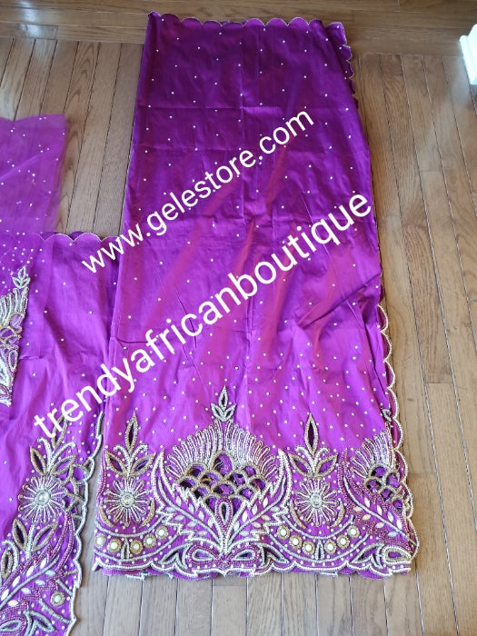 Magenta VIP Hand beaded and crystal Stoned Silk George wrapper, champagne net for blouse. Nigerian, Igbo/Delta traditional wedding out fit. Sold as full 2.5yds with side border design + 2.5yds + 1.8yds matching net for blouse. Quality taffeta silk!