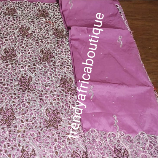 • New arrival: Onion Pink VIP/Celebrant Nigerian Bridal George wrapper with matching net blouse stoned to perfection.  All over sparkling Crystal stones. Niger/Igbo/delta traditional wedding for special occasion.