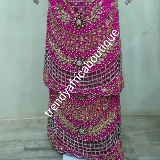 Produce-per-Order Request in any color: luxurious Quality taffeta Silk George wrapper. Fuschia pink Nigerian Bridal beaded and crystal stoned/hand cut work. Sold as 2 wrapper + 1.8yds Net for blouse. Niger/delta/Igbo outfit. 3-4 weeks production