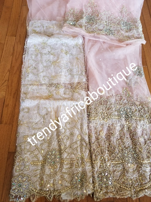 • Super quality sweet peach  VIP Madam Net George wrapper for Nigerian bridal/Celebrant outfit.  all over hand beaded/ stoned 2.5yds+ 2.5yds + 1.8yds matching net for blouse. Happy client Rocking same design in Gold.