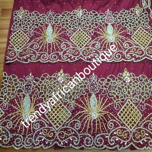 Sale: New arrival Nigerian Tranditional wedding George wrapper. Embellished with quality dazzling beads/crystal stones. Classic wine. Full 5yds + 1.8yds matching blouse + free headtie. Indian-George made with original taffeta silk