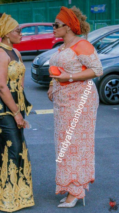 • Sweet Peach VIP Madam Net George wrapper for Nigerian bridal/Celebrant wrapper. Heavily embellished with silver and gold crystal on 2.5yds+ 2.5yds + 1.8yds matching net for blouse . Sold as a set. Special occasion George