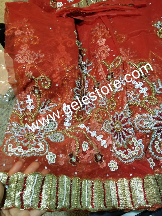 Ready to ship. Gorgeous Red net George. perfect stone work for traditional Bridal outfit. Quality beaded and dazzling crystal stoned on a net George wrapper. 2.5yds + 2.5yds + 2yds.fabric. Sold as a set, price is for a set.