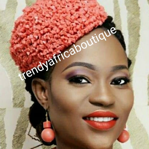 • Nigerian Traditional wedding Bridal Beaded cap.  Edo/Igbo  Bridal Accessories of coral/gold cap. Edo wedding/traditional bridal beaded cap