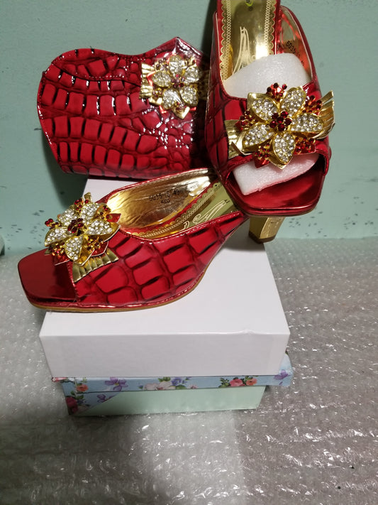 • New arrival Size 39 in Red Italian matching platform shoe and hand clutch. Embellish with crystal stones Italian style shoe and bag. Sold as a set. Heel is 4" shoe run big in size. Comfortable wear