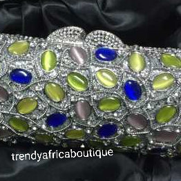 Quality evening hand clutch. Crystal Clutch/purse. All over dazzling crystal stones. Silver/ multi color crystal stones