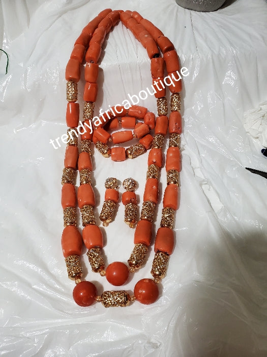Back in stock: Nigerian traditional wedding Edo Coral beaded necklace set in 2 long rows with earrings and bracelet. coral-necklace Sold as a set. Original edo beads for ceremony