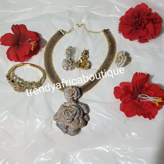 2 tone ( gold& silver) Exclusive Rich Celebrants 4pcs matching set of 22k 2 tone high Electroplated mounted with quality CZ diamond shinning stones setting. Hypoallergenic. Necklace, earrings, ring and bangle set:classic bold flower pendant