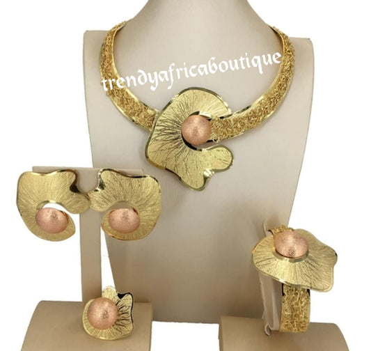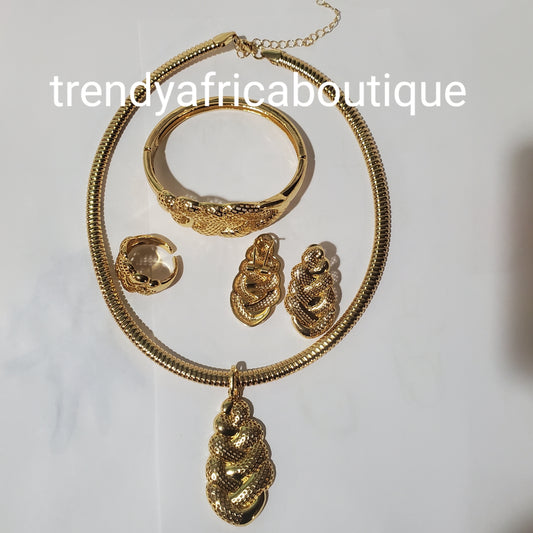 Elegant Dubai 4pcs 18k electroplated choker necklace, matching earrings, bangle & adjustable ring. hypoallergenic plating. Sold as a set and price is for the set. As shown in display photo.