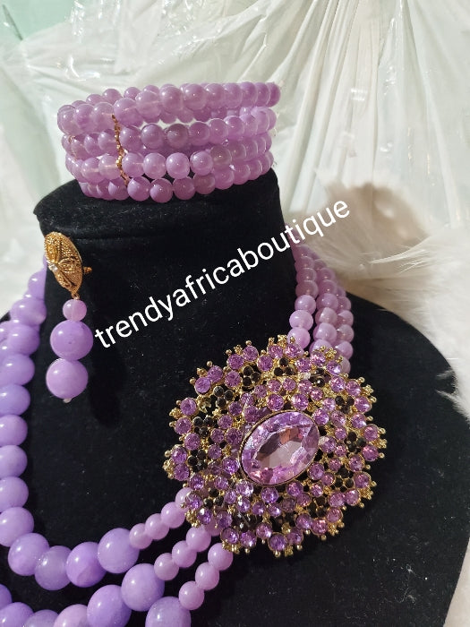 • Lilac 3 row necklace, include matching bracelet and a drop earrings. Accent with big side brooch. For African party weddings/party